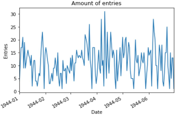#!/usr/bin/env python # coding: utf-8 # # hmjr is a package of tools to help researchers as well as users with simpler needs directly interact with the HMJr diary collection. # # - # # # # # # Getting started # To install our package and import what you need, run the following two lines. # In[ ]: # Install the package that let's us analyze the JSON DB get_ipython().system('pip install hmjr===0.1.0') # Query here is the first point of contact for interacting with the HMJR Diary database. In order to use it, we need to initialize the object. Don't worry about what that means behind the scenes, just make sure to follow Query up with a () whenver we use it, like this: Query(). # # At this point, you may be seeing some suggestions popping up, especially if you're using a Notebook. The best starting point here is just run(), which just grabs entries in the simplest way possible, just the order they happen to be stored in the database. # # So for now, we'll go with that. # In[ ]: from hmjr import Query import matplotlib.pylab as plt import numpy as np import datetime Query().run(max=5).entries # .entries selects the data the query gave us out of the Queries object. And after running that, you should see the data output! # # Before we get to some new queries, lets go over some of the ways we can influence the queries we make. One way is with the default argument max. It refers to the maximum number of entries the query should ask for. This can be changed like this: # In[ ]: Query().run(max=5).entries # This time we should see a lot fewer entries when we run the query. # # Speaking of volumes - lets move on to a more complex query. # In[ ]: Query().withBookBetween(1,5).run().entries # This query should be self explanatory, but it does have a quirk in that the book range includes the lower bound, and excludes the upper bound. So this query will return entries with books 1, 2, 3, 4. # # Under the hood, withBookBetween(start,stop) uses a different function to query the database, and that function is simply withBook(). It works like this: # In[ ]: Query().withBook([1,2,3,4]).run().entries # This is the query our previous withBookBetween(1,5) generated for us. The brackets hold a list of book numbers, and they don't have to be in any order. [1,2,3,4] is the same as [2,4,1,3], and it could even be something like [708,1,66]. # # By the way, all these queries share that default argument max. Its used the same way that we saw earlier. # # Heres our next query: # In[ ]: Query().withKeywords(["Refugee", "refugee"]).run().entries # We see another list, which works the same way as our previous list. This time we have quotes around words to differentiate them from code - don't forget the quotes. If you get a syntax error, that might be why. # # Heres the last kind of query we can do: # In[ ]: Query().withDates({"day": 1, "month": 1, "year":44}).run().entries # Earlier we saw a python list with the square brackets, this notation is called a dictionary, and it holds any number of key:value pairs. Here, our query expects a dictionary with day, month and year keys. # # Now that we've got all the queries working individually, we can combine them before we use run(). # # Try something like: # In[ ]: Query().withKeywords(["Camp", "camp"]).withBookBetween(738, 349).run().entries # We've dropped the .entries off the end of our query, and are storing the result of run() in the variable entries. This result has more to it than just a list of entries. We can call a couple methods on this object. Heres what it looks like: # # In[ ]: entries.associate(["HMJr"]) # What the associate() method does is take a list of words, and rank the appearences of every other word in proximity to this word. "Proximity" is defined as appearing with at least one of the given words in the content of an Index. # # There are two more methods for analyzing the data: the deltaTime() method and the deltaBooks() method. # # They work just like the associate() method, taking a list of words. They both return a dictionary which counts the appearences of the words over the books or over the dates in the entries. # # There are some additional helper methods, such as: # # - headerCounts() counts the occurences of each unique header in the entries # - headerWords() returns a dictionary counting the unique words in the headers # - contentWords() returns a dictionary counting the unique words in the content # - words returns the combination of headerWords() and contentWords() # - headers() returns an array of the header strings in the entries, not sorted # - content() returns an array of the content strings in the entries, not sorted # - dates() returns an array of the date dictionaries in the entries, not sorted # - indexes() returns an array of the index dictionaries in the entries, not sorted # - dateRange() returns the tuple (minimumDate, maximumDate) mentioned in the entries # - bookRange() returns the tuple (minimumBook, maximumBook) mentioned in the entries # In[ ]: # Get the entries with a maximum of 2K entries, and save them in the entries variable. #entries = Query().withBookBetween(696,697).run(max=2000) entries = Query().withBook([696]).run() numEntries = len(entries.content()) print("Number of entries: " + str(numEntries)) print("Avg entries per volume: " + str(numEntries / 1)) # In[ ]: entries.headers()[27] # Your results should have entries with "Camp" or "camp" in their text, in a volume between 738 and 749. # # Now we can make complex queries on the data, lets look at how we can analyze it. # # After we use the run() method, we get a different object back. # In[ ]: from hmjr import Query import matplotlib.pylab as plt import numpy as np import datetime #import stanza #stanza.download('en') #nlp = stanza.Pipeline("en", processors='tokenize,ner', ner_model_path='en_hmjr_nertagger.pt') import json # Import the Query, and some other tools to help analysis # In[ ]: # Make a query for entries with book between 689 and 749 (excluding 749) # Take a